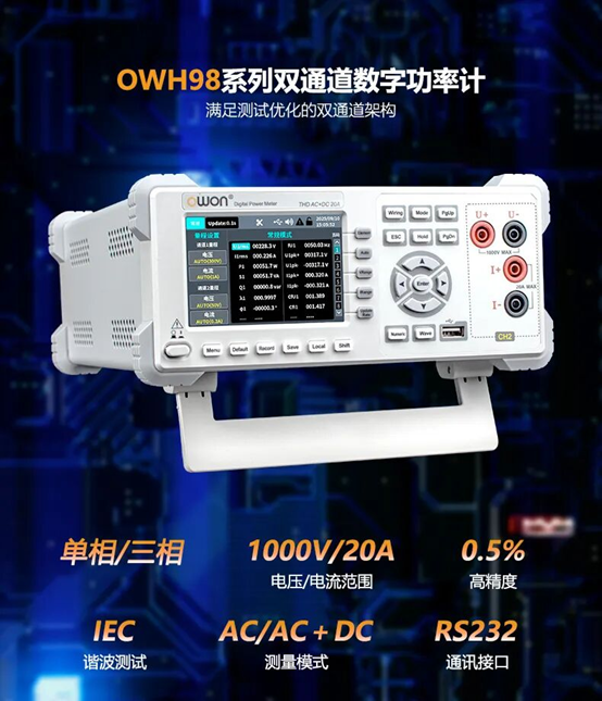 利利普 OWON 全新 OWH98系列數位元功率計震撼登場!OWH98 系列以“雙通道架構 + 寬量程直流測量”為核心亮點,為工程師帶來更高效的一體化電參測試體驗。獨特的前後雙通道設計可同步測量輸入與輸出,讓效率測試更加直觀便捷。CH2 支援交直流採樣,量程高達 1000V / 20A,適用於光伏、儲能、充電樁、適配器、電源研發等多應用場景,打造高性價比、多用途的專業測試平臺。