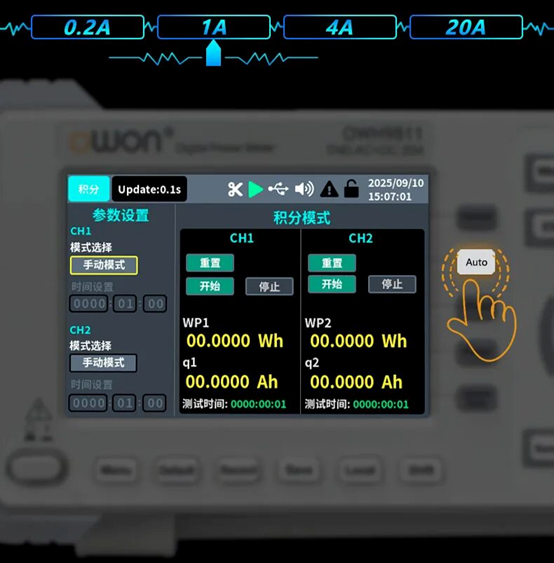 CH1、CH2兩個通道都可以進行有功功率積分Wh、電流積分Ah,支援自動量程或者固定量程設置,輕鬆實現家電能耗、電池充放電,以及功耗效率等量測