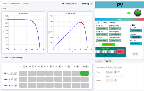 電池板在不同環境條件下的I-V特性曲線,具備測試Static MPPT效能。內置EN50530、Sandia光伏曲線模型。標配光伏曲線模擬軟體,可控制多台電源,實現 MPPT追蹤測試,為用戶提供高效的測試解決方案。
