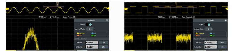 支持垂直放大(最高62.5μV/div)與水準縮放的雙向調節,工程師可直接通過觸控式螢幕調整放大視窗的位置和尺寸,即時觀測微弱信號或大信號中的局部細節。該功能操作直觀,只需拖動即可鎖定目的地區域,在放大視圖中精准分析波形特徵,提供了高解析度、高靈活性的測試解決方案。